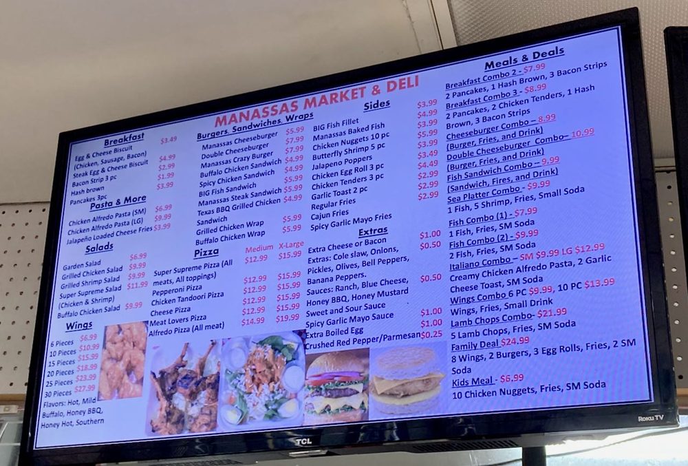 Manassas Market & Deli offers amenities such as Takeout, Delivery, Wheelchair Accessible, Pets Welcome, Outdoor Parking, Parking Lot, Accepts Contactless Payments, Takeout, Delivery, Wheelchair Accessible, ensuring a comfortable and convenient experience for clients.